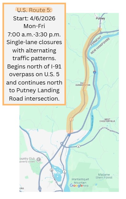 Beginning Wednesday, April 22, one 1.5 mile-long, single-lane closure will be in place on U.S. Route 5 beginning at the Interstate 91 overpass in Brattleboro and progressing north. Flaggers will assist with alternating traffic patterns through the work zone. The work zone will shift from northbound to southbound travel lanes and continue to progress north over the course of the week. Motorcyclists should watch for grooved and uneven surfaces. Expect delays in this area.