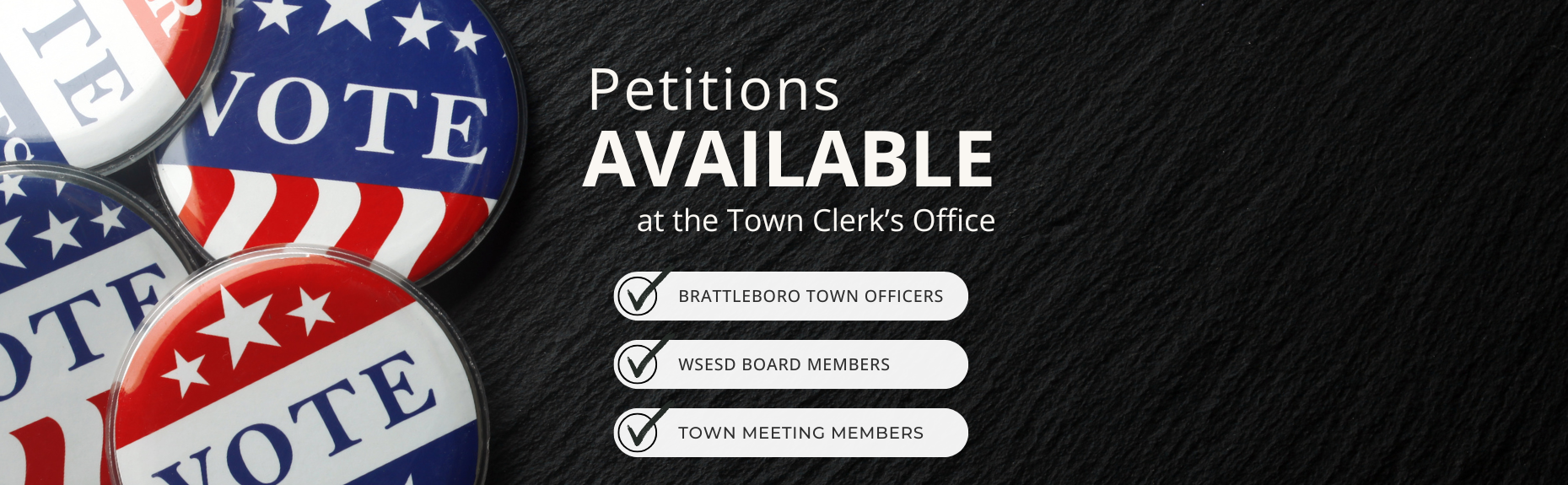 Petitions for Town Officers and WSESD Brattleboro Board Members must contain at least 30 valid signatures of registered Brattleboro voters and be filed in the Town Clerk’s Office no later than Monday, January 26, 2026, at 5 p.m. to have their name placed on the ballot.