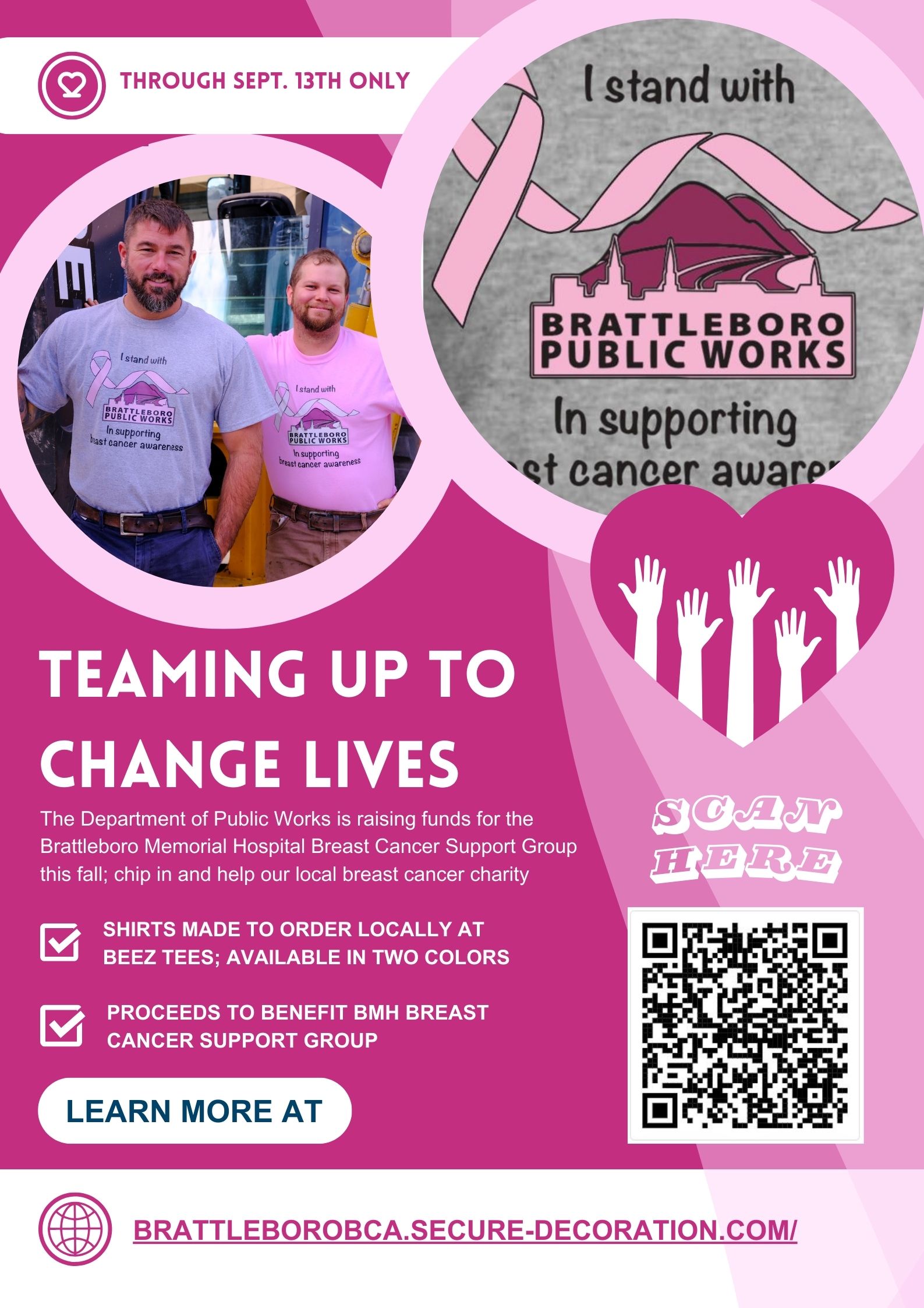The Department of Public Works is raising funds for the Brattleboro Memorial Hospital Breast Cancer Support Group. Support the cause by purchasing a custom T-shirt through this web store.
