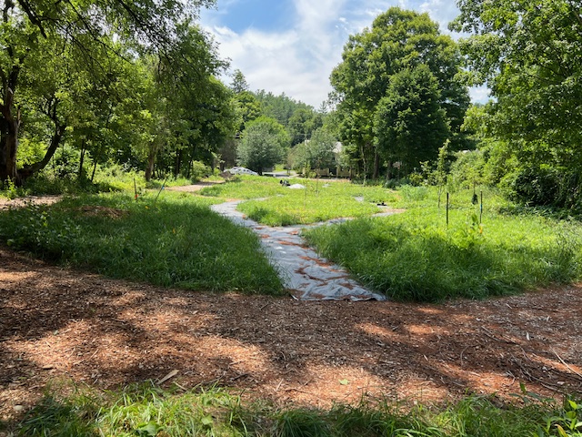 The riparian buffer zone will be left undeveloped except for a pathway and possibly another seating area and a table where visitors may enjoy the sounds of the brook. Pathways will be mulched with wood chips and white clover may be planted in turf areas to reduce the need for mowing.