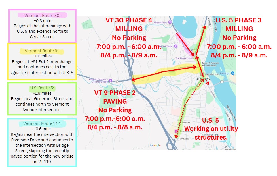 Crews are adding an overnight shift on Friday, Aug. 1 from 7 p.m. to 6 a.m. They plan to pave on Vermont Route 9 (Western Avenue) west of Green Street and on U.S. Route 5 (Main Street) north of the downtown area. Additionally, a crew will adjust structures on U.S. 5 (Canal Street) west of downtown. Single-lane closures with alternating traffic controlled by flaggers will be in place.