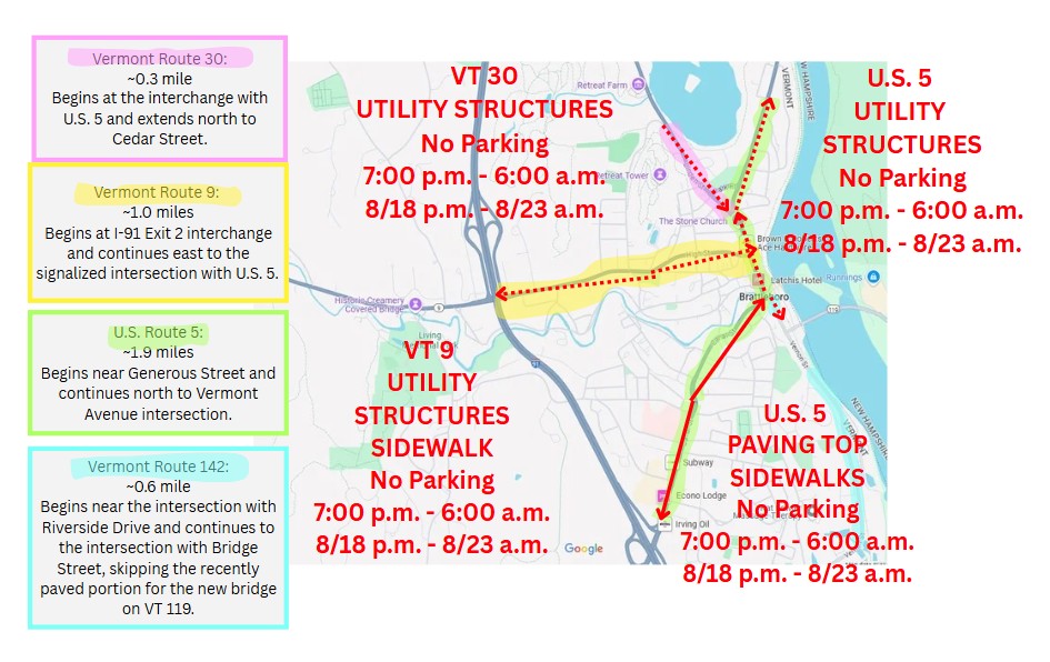 Nighttime single-lane closures will be in place next week on Monday night through Saturday morning from 7 p.m. to 6 a.m. Work will continue on Vermont Route 9 (Western Avenue and High Street), U.S. Route 5 (Canal Street and Main Street), and Vermont Route 30 (Linden Street). Flaggers will be present to direct one-way alternating traffic through multiple work zones. Motorcyclists should watch for grooved and uneven surfaces and all motorists should be aware of raised utility structures and wet paint.