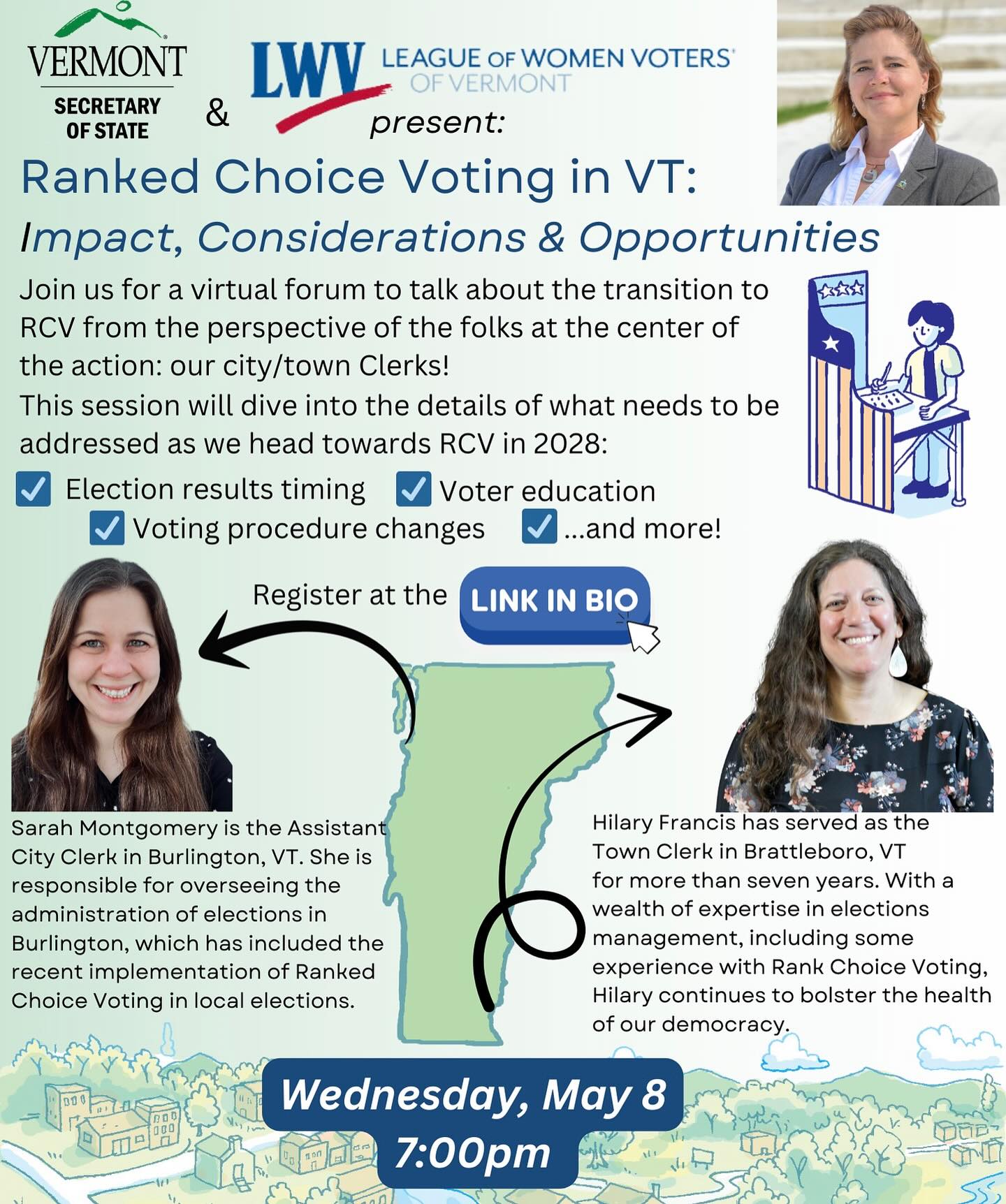 The Vermont Secretary of State is hosting a virtual forum tomorrow, May 8, at 7 p.m. to discuss ranked choice voting. The panel includes our very own Town Clerk, Hilary Francis! The discussion will include an overview of the impact and opportunities involved with ranked choice voting from the perspective of those directly involved with overseeing elections.