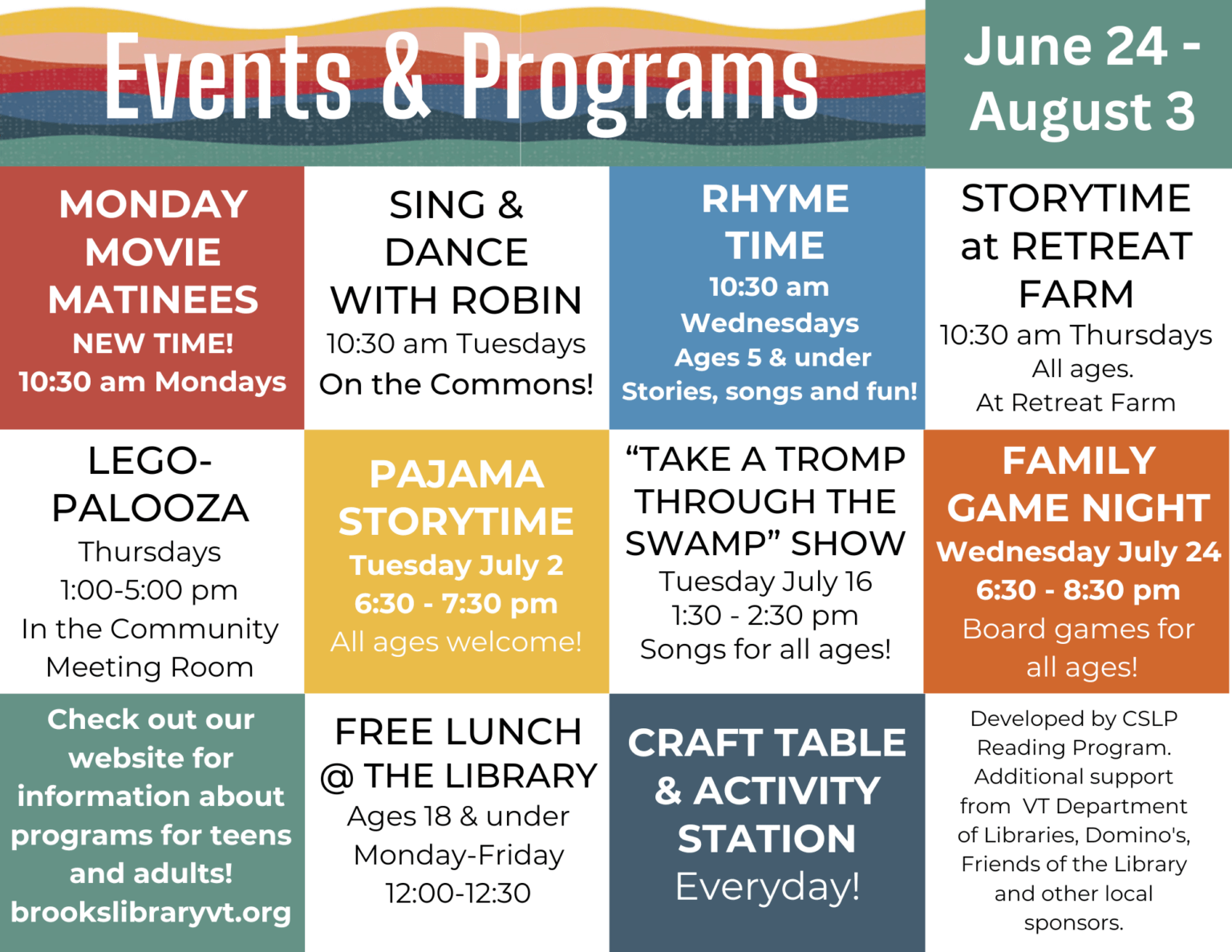 Brook's Memorial Library's annual Summer Reading Program is happening from June 17 through August 3, 2024. For updates, visit Brook's website.