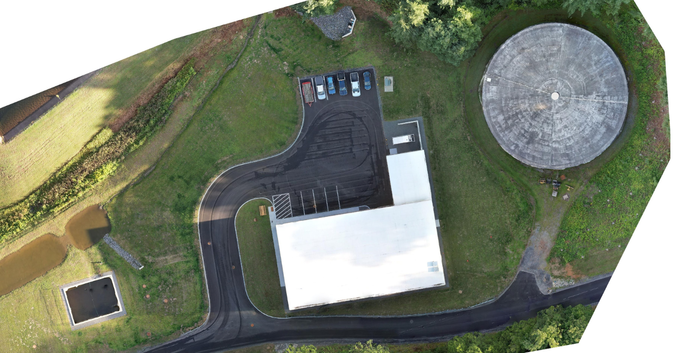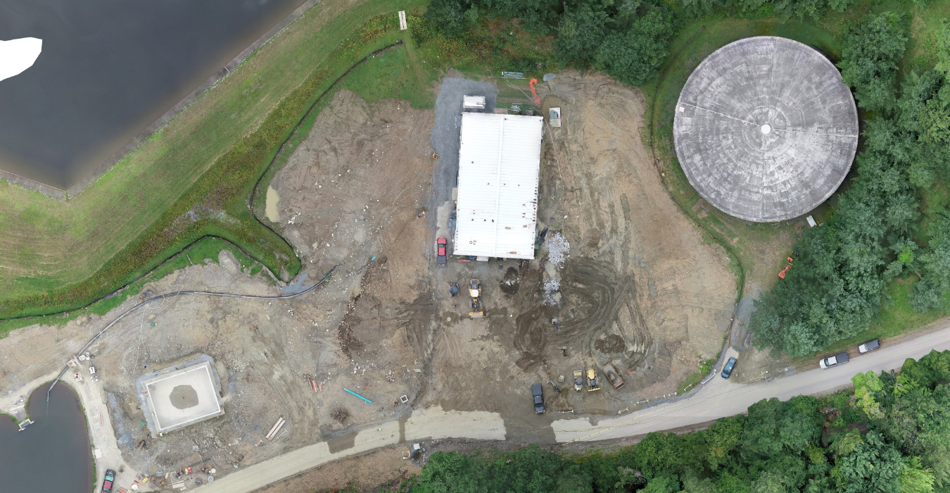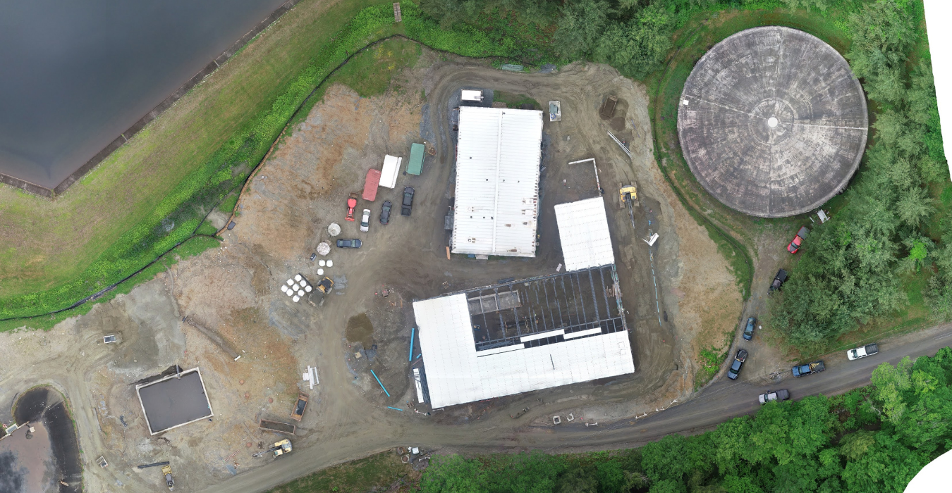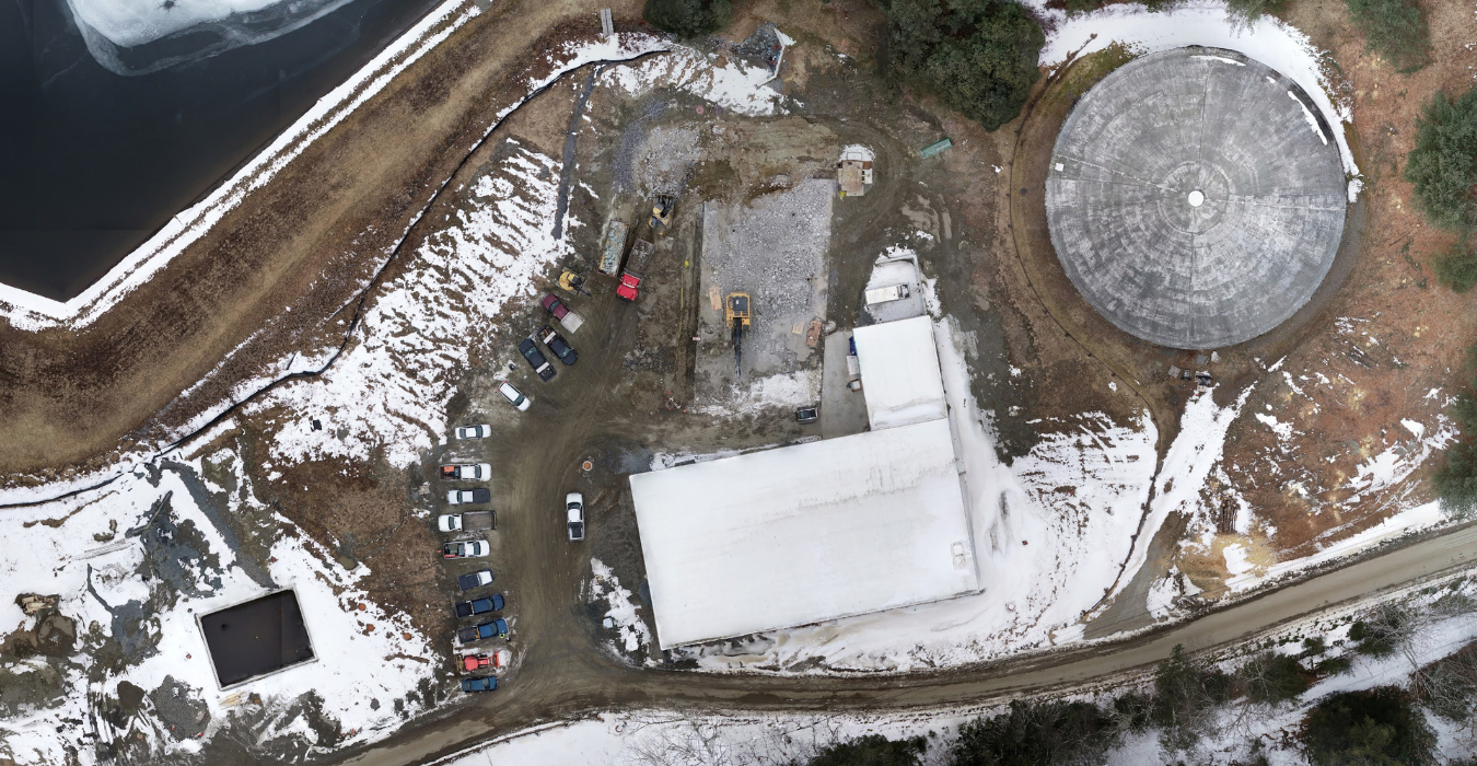 Above: Photos from the ribbon-cutting ceremony, held at the new water treatment facility on Aug. 20, 2024. Below: Aerial photographs of the construction process.